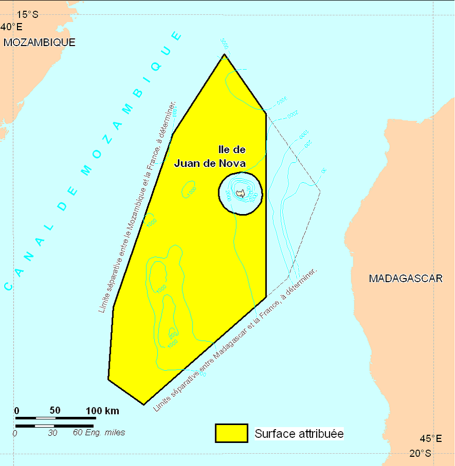 L’exploitation du territoire de Juan de Nova est, on le rappelle, controversée (voir le dossier Juan de Nova, du gaz dans l’eau entre Madagascar et la France). Objets de litiges entre la France, Madagascar, les Comores, Maurice, mais aussi le Mozambique qui revendiquent les uns et les autres leurs souveraineté respective, les Zones Economiques Exclusives (ZEE) dessinées sur la région ne sont pas reconnues par les différentes parties. Des délimitations existent de manière théorique, utilisées par les opérateurs de la grande pêche pour la définition de leurs zones d’intervention et la gestion de leurs quotas, mais elles n’ont jamais fait l’objet d’aucun accord ni traité. Les permis de recherche sur Juan de Nova accordés par le ministère français de l’environnement sont caractérisés par des « limites séparatives entre la France et Madagascar à déterminer ». La ZEE française sur les éparses est elle-même définie (loi du 16 juillet 1976) « depuis la limite des eaux territoriales jusqu’à 188 miles marins au-delà de cette limite, sous réserve d’accords de délimitation avec les Etats voisins ».