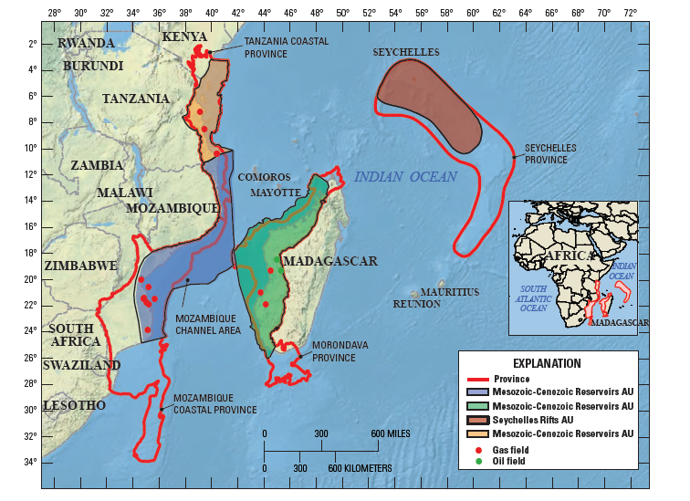 L’US Geological Survey, a remis au président Obama en Avril 2012 un rapport stratégique qui évalue les réserves en énergies fossiles de 4 nouvelles « provinces » énergétiques dans l’Océan Indien : la côte tanzanienne, la côte mozambicaine, les Seychelles, la côte ouest malgache (Morondava Basin).