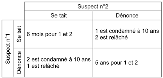 - si un seul des deux prisonniers dénonce l’autre, il est remis en liberté alors que le second obtient la peine maximale (10 ans) ;