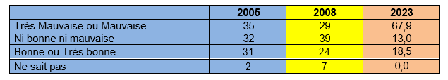 Quand les tenants actuels du pouvoir se vantent de leur gouvernance, de leurs succès, de leurs réalisations et autres Velirano et, surtout de l’adhésion du “peuple” à leur action, il était intéressant de comparer l’évolution du sentiment des acteurs concernés en comparant les données des enquêtes de 2005, 2008, 2023.