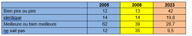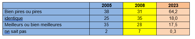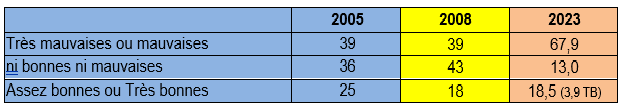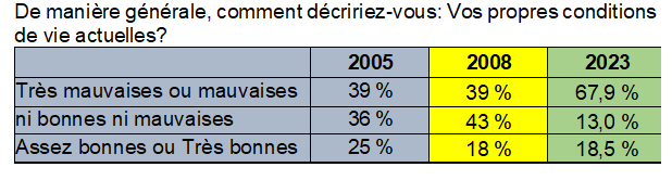 67,9% des personnes interrogées que leurs conditions de vie sont mauvaises ou très mauvaises. Elles sont presque deux fois plus nombreuses qu’en 2008 à faire ce constat. Il faut toutefois constater que 3,9% considèrent en 2023 que leurs conditions de vie sont très bonnes (elles n’étaient que 1% en 2005), ce qui dénote une augmentation importante des inégalités avec une augmentation de nouveaux riches et une explosion des effectifs des nouveaux pauvres.