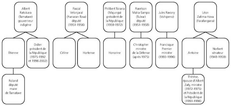 - Dans ce tableau, on relève que Didier Ratsiraka a épousé Céline Velonjara, Hortense Velonjara a épousé Christopher Raveloson-Mahasampo, Honorine Tsiranana a épousé Francisque Ravony et que Thérèse Zafimahova a épousé Albert Zafy. Et l’on pourrait rajouter bien d’autres noms et d’autres précisions. Étienne Ratsiraka était ainsi le gendre d’un ministre PSD, Jean-François Jarison. Une troisième fille Velonjara, Solange, était l’épouse d’un officier, le commandant Patureau, membre du Conseil Suprême de la Révolution (CSR) après 1975. Dans les années 2000, Roland Ratsiraka, candidat aux élections présidentielles d’octobre 2013, n’est pas le seul acteur politique de la troisième génération, mais il n’est pas possible ici d’être exhaustif. Un fils de Christopher Raveloson-Mahasampo, gouverneur de Tuléar après 1998, sera limogé par Ravalomanana, successeur de Ratsiraka. Le plus important dans cette génération est sans doute Pierrot Rajaonarivelo, secrétaire général de l’Avant-garde de la Révolution Malgache (Arema), le parti de Ratsiraka, vice-Premier ministre de 1997 à 2002, et ensuite, en exil, principal rival du président Ravalomanana. Il est le petit-fils de Laingo Ralijaona, membre fondateur du Padesm à Tamatave, conseiller de la République (1952-1958), et à Paris, correspondant du jeune Didier Ratsiraka, interne au lycée Henri-IV en 1956-1958, en préparation à l’École navale, rôle dans lequel Norbert Zafimahova lui succédera en 1958-1960.